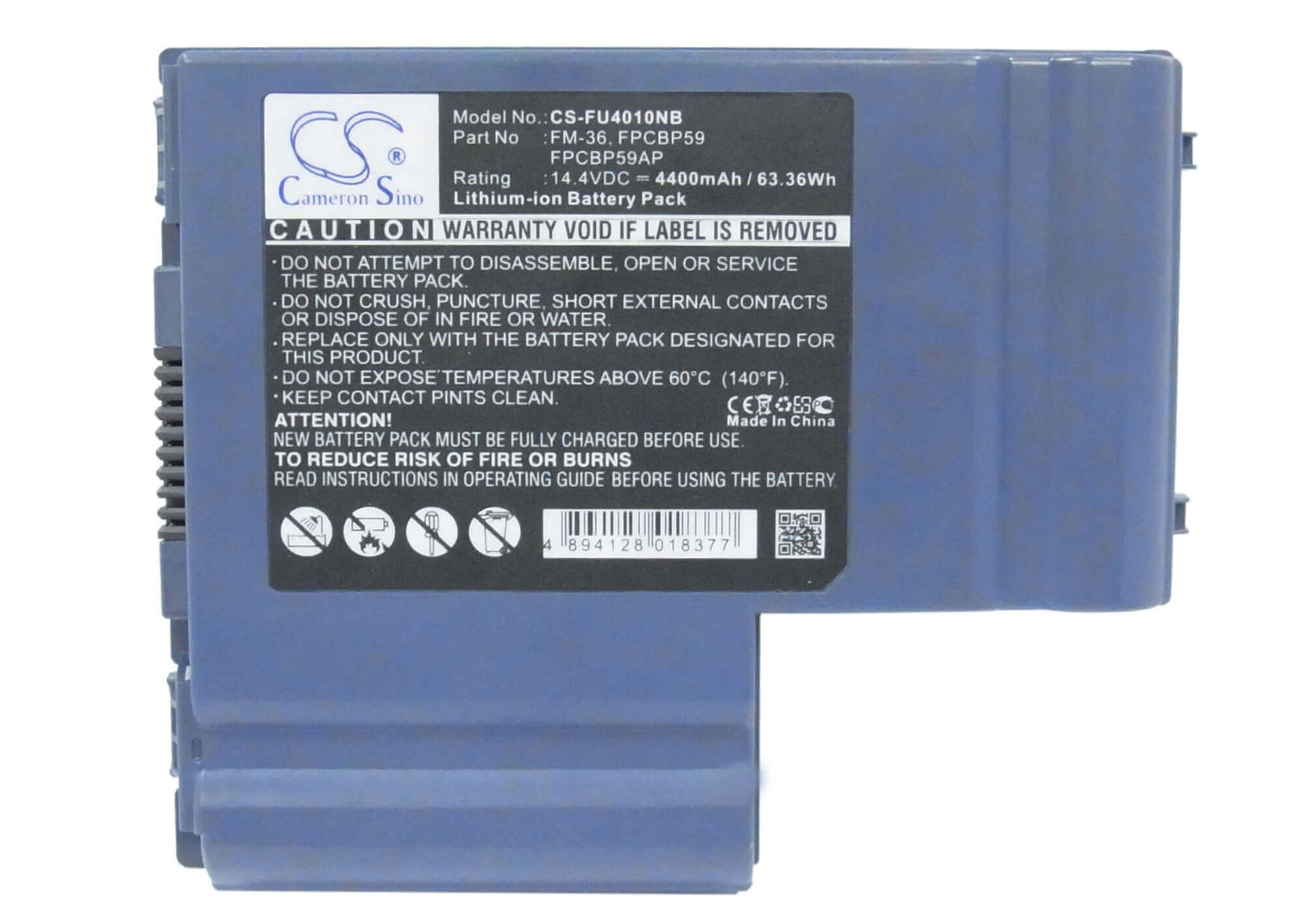 The battery shown will replace your original and provide you with an economical alternative to expensive OEM batteries, we also guarantee the battery to be fresh and free from defects. Batteries come in all shapes and sizes, quite often a single model of battery will actually replace hundreds of other models. The manufacturers in their wisdom have assigned different part numbers to like batteries. We can usually cross reference this type of product to the correct replacement for you. This battery is designed to replace the battery in models described below Chemistry Li-ion Voltage 14.4VCapacity4400mAh / 63.36Wh Warranty 1 Year Model Number CS-FU4010NB Color BlackDimensions(mm)129.25 x 72.25 x 20.20mmReplaces ManufacturersFujit'suBatteries come in all shapes and sizes, quite often a single model of battery will actually replace hundreds of other models. The manufacturers in their wisdom have assigned different part numbers to like batteries. We can usually cross reference this type of product to the correct replacement for you. Make sure you check that both your battery model and device are shown the information tables below. If for any reason the product develops a manufacturing defect during the 12 month warranty period we will replace the defective item free of charge. You should expect for your new battery to last for between 400 and 500 cycles. A cycle can be described as a full charge and discharge. Different chemistries can be charged and discharged a different amount of times. ISO 9001 certification ensures that strict manufacfuring standards are adhered to. Safety is primary concern and we use only high quality components to ensure that strict standards are met. The batteries we supply should perform as well as your original. The products that this replacement battery is designed to replace are shown in the table below. Special Remarks:-Device Models and Battery numbers that this battery is known to support:-Device Models SupportedFujit'su, Fmv Biblo Mg75e, Fmv Biblo Mr16ah, Fmv Biblo Mr16b, Fmv-7160mr2, Fmv-7180mr3, Ifebook E7110, Lifebook C1110, Lifebook E2010, Lifebook E4010, Lifebook E4010d, Lifebook E7010 Battery Models Supported Fujit'su, Fm-36, Fpcbp59, Fpcbp59apManufacturers that this product will replace:- Manufacturers Supported Actual manufacturerFujit'suCameron SinoBattery Selection (Please read - Important)There are so many different models of battery available today for so many different products. it's easy to make a mistake. It may be worth you confirming with us if you are really not sure which battery to order. We try to keep our records updated to the best of our ability but manufacturers can change fitment without notice.Usually if the capacity of the battery that you are viewing here is much greater than your original this may mean that the battery is larger and will either require the cover provided to be used or may protrude from your device. The battery will still fit and function but this may affect fitment into any cases or holders that you may have.
