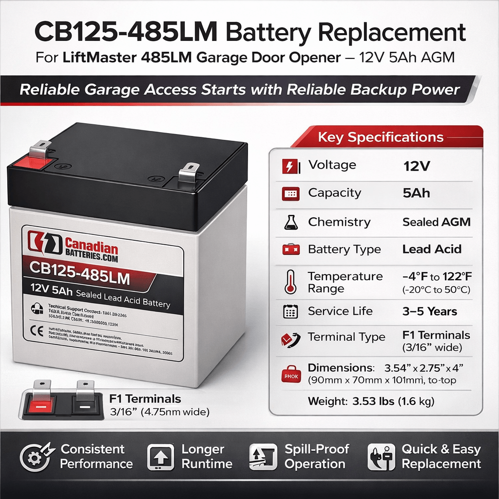 Never get locked out again! The CB125-485LM is a high-performance 12V 5Ah AGM battery specifically designed to replace the battery in LiftMaster 485LM garage door openers. Whether you’re dealing with a sudden blackout or simply replacing an aging battery, this maintenance-free power source ensures your garage door opener functions exactly when you need it most.