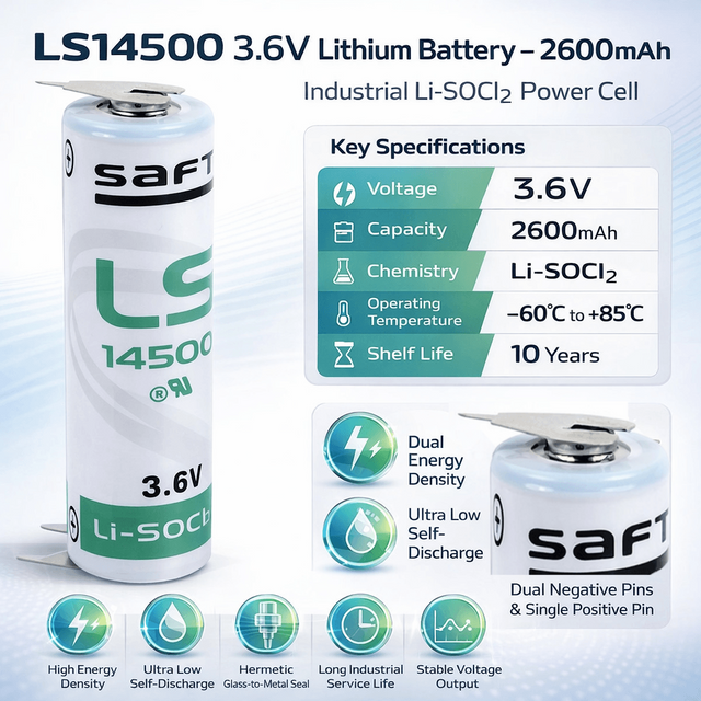 Saft LS14500 AA Lithium Battery – 3.6V 2600mAh with Dual Negative Pins & Single Positive Pin