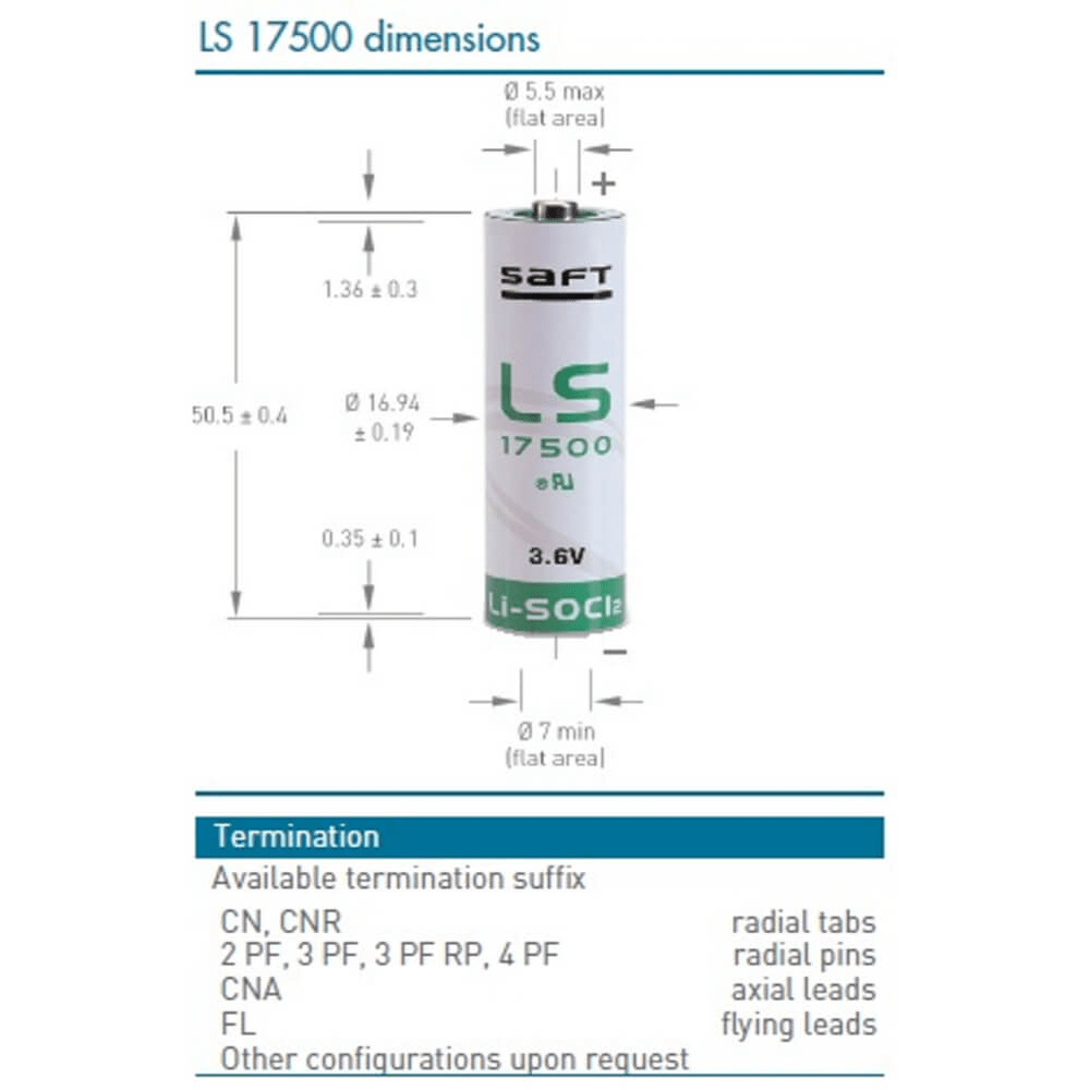 Explore our range of Saft LS17500 lithium batteries and find the perfect connector type for your application. If you have any questions or need assistance in choosing the right battery and connector combination, please contact our knowledgeable support team.
