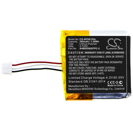 3.7V, Li-Polymer, 350mAh, Headset battery fits Sennheiser, Ahb552826tpc-2, Gsp 350, Gsp 500, 1.3Wh
