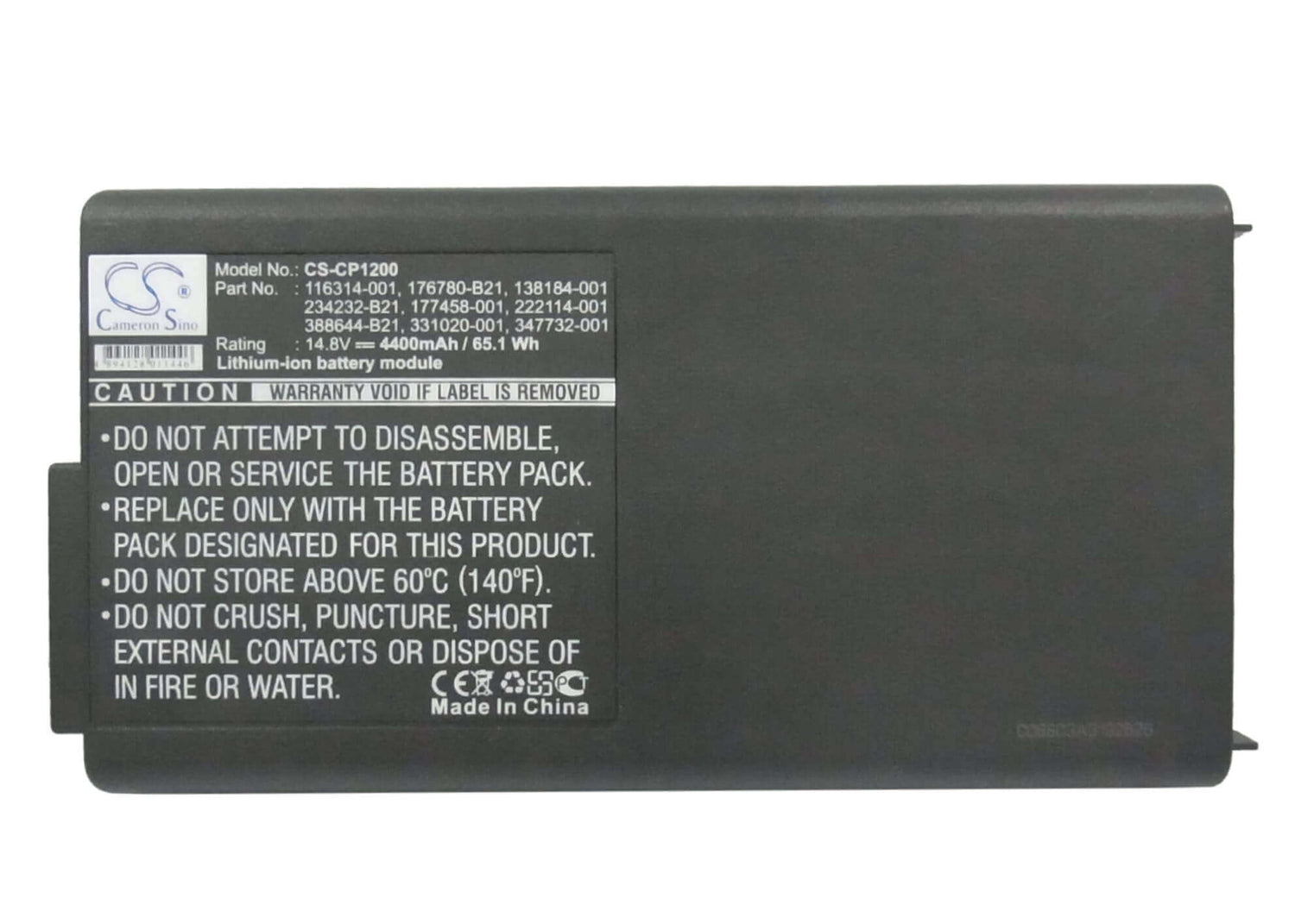 Look no further than Canadian Batteries your faithful, reliable and true canadian supplier, Our batteries are fresh from the factory and usually no more than 90 days old. We endeavor to keep our data as current as possible, but there will be occasions when new models have not been updated to the website yet. Contact us and we will confirm fitment. This battery is designed to replace the battery in models described below Chemistry Li-ion Voltage 14.8VCapacity4400mAh / 65.12Wh Warranty 1 Year Model Number CS-CP1200 Color BlackDimensions(mm)148.00 x 77.30 x 20.10mmReplaces ManufacturersCompaqWe endeavor to keep our data as current as possible, but there will be occasions when new models have not been updated to the website yet. Contact us and we will confirm fitment. it's important to confirm the information from your device before ordering, contact us before ordering if you are not sure. The warranty we offer on all of our products is one of the best in the business, we make returns easy and will quickly test and replace any product found to have an issue within the 12 or 6 months warranty period. Different chemistries of batteries have different cycle lives, Li-Ion usually lasts for around 400 to 500 cycles, Lithium Polymer is the same. Nimh batteries will usually last for around 500 cycles. A cycle is a full discharge and recharge of the battery. If you are looking for a High quality replacement battery with ISO 9001 certifications in place then look no further. This battery is designed to be as robust and as safe as the original OEM battery. Cameron Sino actually manufacture batteries for many OEM companies. The only difference that you will find is the label that is installed. This product is designed to replace batteries as shown in the specifications table below. Special Remarks:-Device Models and Battery numbers that this battery is known to support:-Device Models SupportedCompaq, Presario 1200, Presario 1200an, Presario 1200ap, Presario 1200ap-470011-846, Presario 1200ap-470011-847, Presario 1200ap-470011-848, Presario 1200ap-470015-558, Presario 1200ap-470016-373, Presario 1200ap-470021-192, Presario 1200ap-470021-205, Presario 1200ap-470021-207, Presario 1200ca, Presario 1200ca-1200ca, Presario 1200cl, Presario 1200ea, Presario 1200ea-470016-814, Presario 1200ea-470016-815, Presario 1200ea-470016-816, Presario 1200ea-470016-817, Presario 1200ea-470017-499, Presario 1200la, Presario 1200la-470013-575, Presario 1200sc, Presario 1200srp-470013-553, Presario 1200srp-470016-807, Presario 1200srp-470018-783, Presario 1200srp-470020-327, Presario 1200srp-470020-329, Presario 1200srp-470020-333, Presario 1200srp-470020-334, Presario 1200srp-470020-335, Presario 1200srp-470020-351, Presario 1200srp-470020-360, Presario 1200srp-470020-364, Presario 1200srp-470020-366, Presario 1200srp-470020-386, Presario 1200srp-470020-390, Presario 1200srp-470020-402, Presario 1200srp-470020-404, Presario 1200srp-470020-407, Presario 1200srp-470020-424, Presario 1200srp-470020-427, Presario 1200srp-470020-440, Presario 1200srp-470020-441, Presario 1200srp-470020-444, Presario 1200srp-470020-449, Presario 1200srp-470023-468, Presario 1200t, Presario 1200t-12xl, Presario 1200t-12xl2, Presario 1200t-470017-081, Presario 1200tc, Presario 1200th, Presario 1200us, Presario 1200xl, Presario 1200-xl102, Presario 1200-xl104, Presario 1200-xl105, Presario 1200-xl106, Presario 1200-xl107, Presario 1200-xl108, Presario 1200-xl110, Presario 1200-xl111, Presario 1200z, Presario 1200z-1200z A/900, Presario 1200z-225168-999, Presario 1200za, Presario 1200za-1200z A/1.0g, Presario 1201ap, Presario 1201ap-470013-578, Presario 1201ea, Presario 1201s, Presario 1201z, Presario 1202ea, Presario 1203cl, Presario 1205ea, Presario 1206r, Presario 1207, Presario 1210, Presario 1210ca, Presario 1210ea, Presario 1210jp, Presario 1210la, Presario 1210us, Presario 1211ca, Presario 1211ea, Presario 1211la, Presario 1212cl, Presario 1212ea, Presario 1213cl, Presario 1213ea, Presario 1214, Presario 1214ea, Presario 1214fr, Presario 1214ne, Presario 1214sr, Presario 1215, Presario 1215ea, Presario 1215us, Presario 1216, Presario 1216ea, Presario 1216jp, Presario 1216uk, Presario 1216us, Presario 1217jp, Presario 1219jp, Presario 1220, Presario 1221, Presario 1230, Presario 1232, Presario 1234, Presario 1235, Presario 1236, Presario 1237, Presario 1240, Presario 1242, Presario 1244, Presario 1246, Presario 1247, Presario 1250, Presario 1255, Presario 1256, Presario 1260, Presario 1266, Presario 1267, Presario 1270, Presario 1275, Presario 1277, Presario 1278, Presario 1279, Presario 1280, Presario 12xl125, Presario 12xl126, Presario 12xl127, Presario 12xl128, Presario 12xl201, Presario 12xl204, Presario 12xl220, Presario 12xl223, Presario 12xl3, Presario 12xl300, Presario 12xl300b, Presario 12xl302, Presario 12xl304, Presario 12xl310, Presario 12xl320, Presario 12xl323, Presario 12xl325, Presario 12xl326, Presario 12xl327, Presario 12xl330, Presario 12xl400, Presario 12xl401, Presario 12xl403, Presario 12xl404, Presario 12xl410, Presario 12xl420, Presario 12xl423, Presario 12xl426, Presario 12xl427, Presario 12xl430, Presario 12xl500, Presario 12xl501, Presario 12xl504, Presario 12xl505, Presario 12xl510, Presario 12xl510a, Presario 12xl526, Presario 12xl527, Presario 12xl530, Presario 1600s, Presario 1600-xl1, Presario 1600-xl140, Presario 1600-xl141, Presario 1600-xl142, Presario 1600-xl143, Presario 1600-xl144, Presario 1600-xl145, Presario 1600-xl146, Presario 1600-xl147, Presario 1600-xl150, Presario 1600-xl151, Presario 1600-xl152, Presario 1600-xl153, Presario 1600-xl154, Presario 1600-xl155, Presario 1610, Presario 1611, Presario 1620, Presario 1621, Presario 1622, Presario 1625, Presario 1626, Presario 1640, Presario 1650, Presario 1655, Presario 1660, Presario 1670, Presario 1672, Presario 1675, Presario 1680, Presario 1681, Presario 1685, Presario 1687, Presario 1688, Presario 1690, Presario 1692, Presario 1693, Presario 1694, 