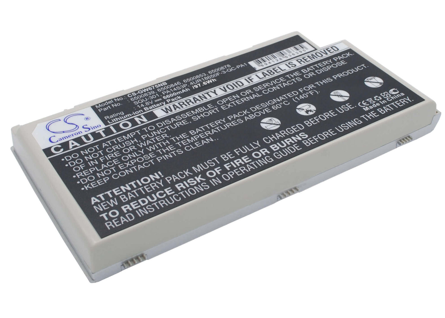 The CameronSino range of batteries will provide you with a reliable long service product. The batteries are built to last yet amazingly affordable. Quite often due to the data not being available this battery will fit unlisted models. As this information comes available we do update these fitments on a regular basis. If you are not sure as to which battery you need to order please contact us and we can guide your selection. This battery is designed to replace the battery in models described below Chemistry Li-ion Voltage 14.8VCapacity6600mAh / 97.68Wh Warranty 1 Year Model Number CS-GW675NB Color GreyDimensions(mm)193.70 x 100.79 x 24.53 mmReplaces ManufacturersGatewayQuite often due to the data not being available this battery will fit unlisted models. As this information comes available we do update these fitments on a regular basis. If you are not sure as to which battery you need to order please contact us and we can guide your selection. Please match both the model of your device and battery number before ordering. 12 Months warranty is usually standard on all Cameron Sino products. If there is any difference in this policy it will be stated on this page. Any misuse of the battery or modifications will invalidate the warranty. You should expect for your new battery to last for between 400 and 500 cycles. A cycle can be described as a full charge and discharge. Different chemistries can be charged and discharged a different amount of times. How can I be sure that this battery is safe? ISO 9001 certification means that our factories never take shortcuts with the manufacture of our batteries. All safety components are iuncluded. This ensures safe trouble free operation of this replacemnent battery. The specifications should be the same as or better than the original. Fitments that we know that this battery are shown below. Special Remarks:-Device Models and Battery numbers that this battery is known to support:-Device Models SupportedGateway, M675, M675cs, M675e, M675e Plus, M675pir, M675prr, M675x, M675xl Battery Models Supported Gateway, 4ur18650f-3-qc-pa1, 6500839, 6500846, 6500853, 6500878, Pa14s3p, Squ-301Manufacturers that this product will replace:- Manufacturers Supported Actual manufacturerGatewayCameron SinoBattery Selection (Please read - Important)Please make sure that the device manufacturer, The model number and also the battery part number are all listed in our product details. Some manufacturers have more than one battery type fitted in like models. We recommend that you remove the original battery before ordering to confirm this. If you are not sure we may be able to confirm for you.Batteries shown with an extended back cover in the image above will need to use this cover. The battery is larger and the cover is required to be able to fit the device properly. This may affect fitment into any cases or holders you may have. Extended capacity batteries for laptops may be larger and protrude from the rear of your laptop or may raise the laptop up at the bottom