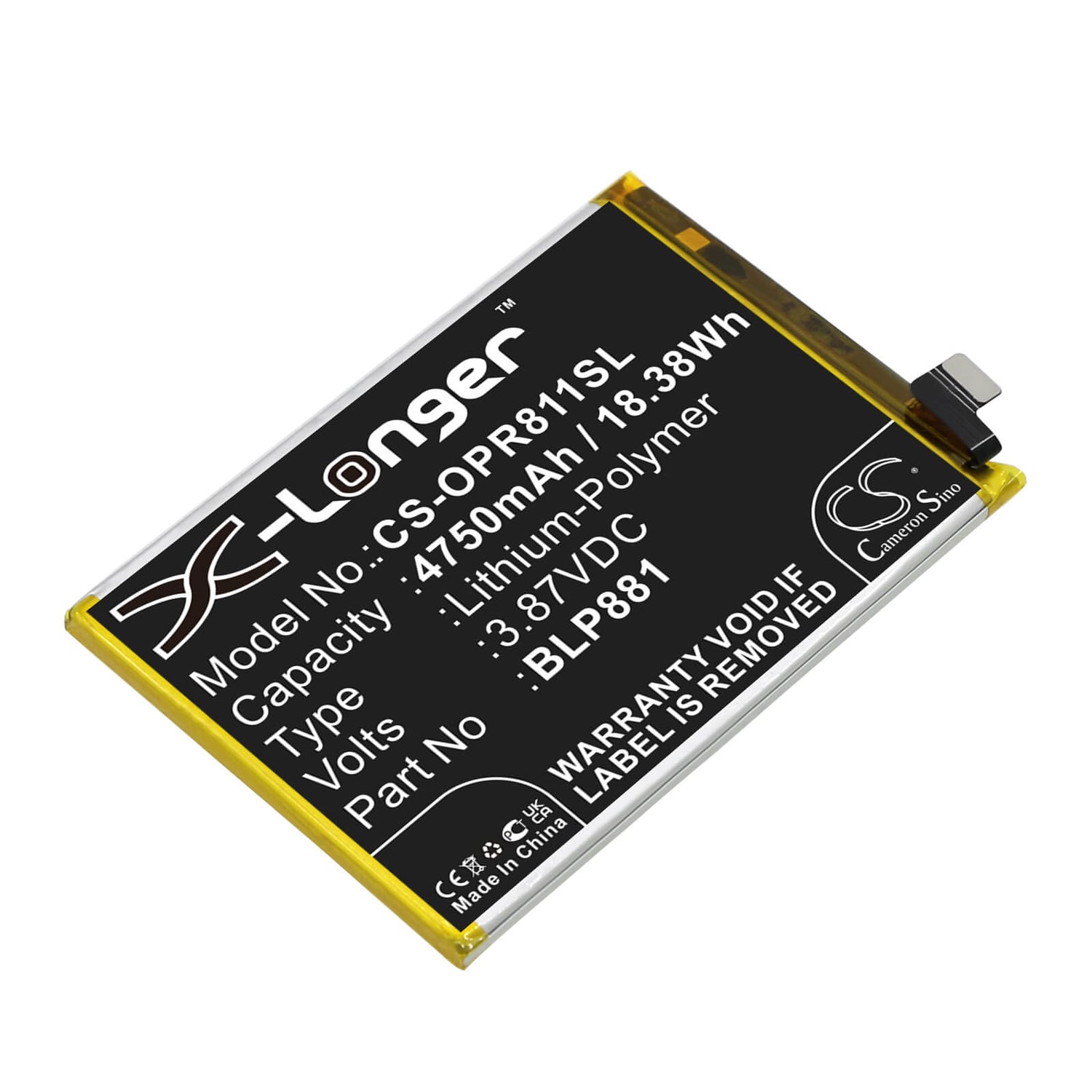 Déverrouiller les performances ininterrompues avec le Cameron Sino CS-OPR811SL Batterie de remplacement, conçue spécifiquement pour le smartphone OPPO. Cette haute qualité 4750mAh / 18,38Wh Batterie Li-polymère délivre un fiable Tension de 3,87 V avec une cote d'énergie de 18,38Wh, en vous assurant que votre appareil fonctionne à une efficacité maximale tout au long des séances prolongées. Quoi que vous fassiez, cette batterie fournit le pouvoir et fiabilité vous avez besoin.