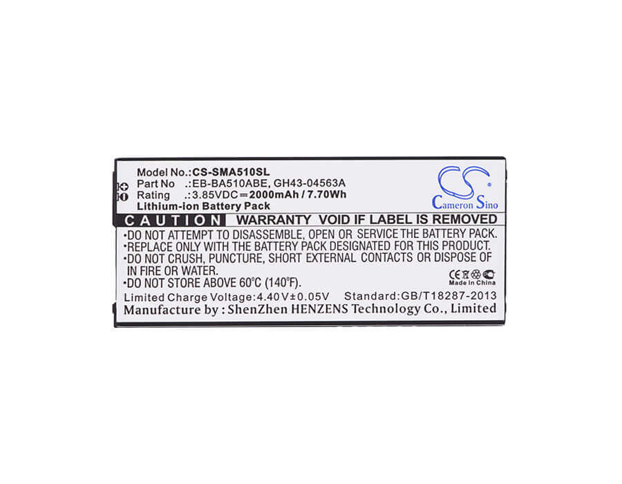 3.85 V, Li-ion, 2000mah, Smartphone Battery convient à Samsung, EB-BA510ABE, Galaxy A5 2016 Duos, SM-A5100, 7,7Wh