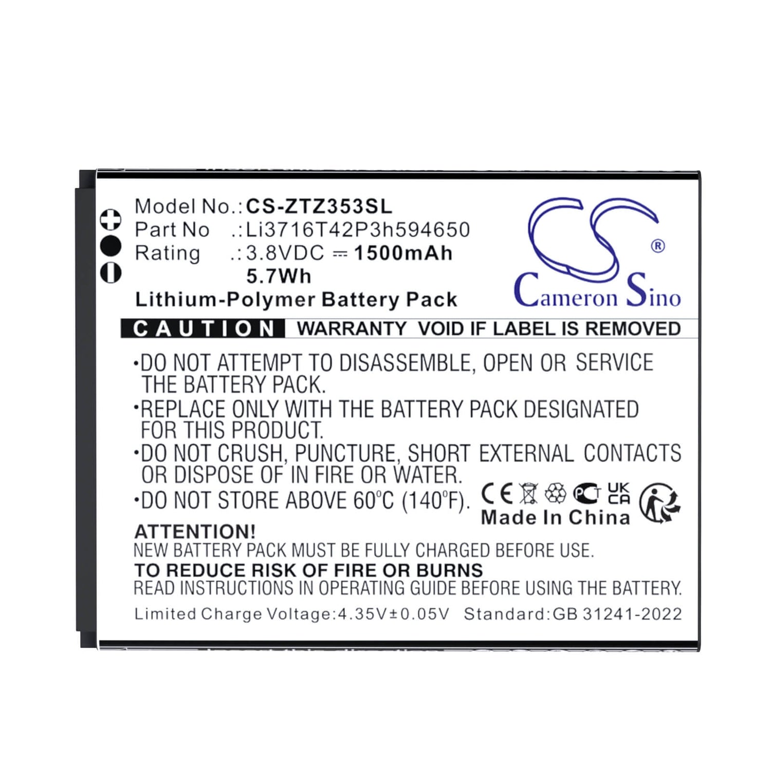 Keep your ZTE 353VL smartphone running smoothly with the reliable Cameron Sino CS-ZTZ353SL replacement battery. Built with advanced Li-Polymer technology, this premium-grade 1500mAh (3.8V / 5.7Wh) battery delivers dependable energy so you can stay connected for longer—whether you’re making calls, texting, browsing, or using apps throughout your day.