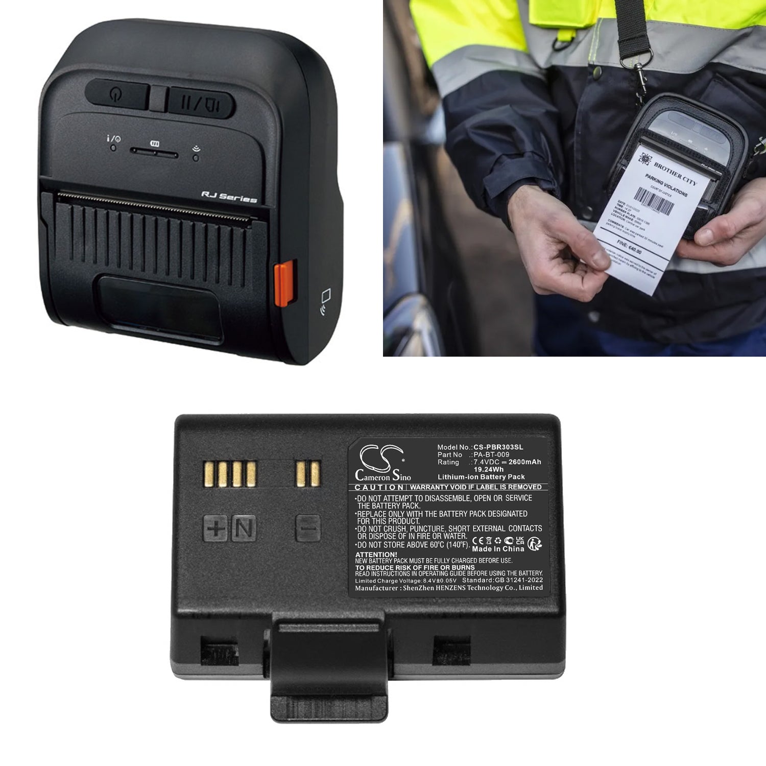 7.4V, Li-ion, 2600mAh, Portable Printer battery fits Brother, PA-BT-009, RJ-3035B, RJ-3055WB, 19.24Wh