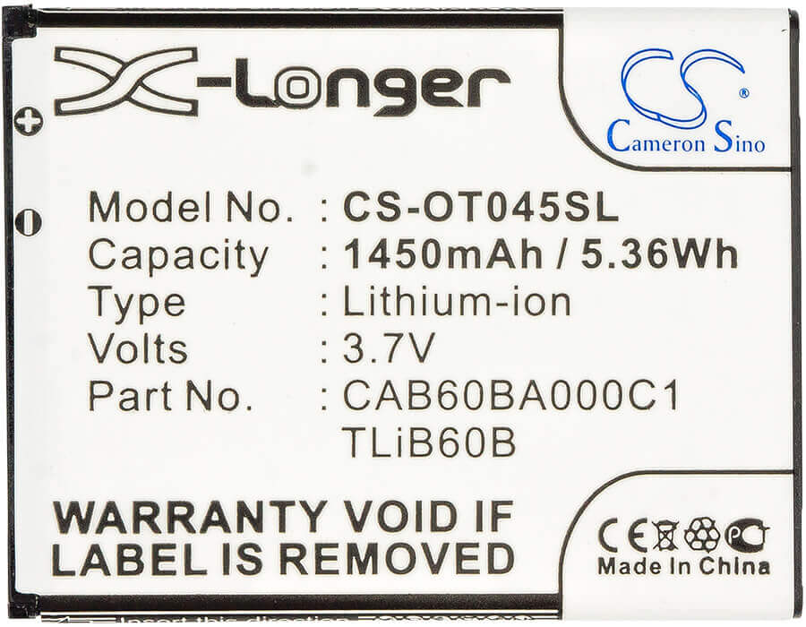 Unlock uninterrupted performance with the Cameron Sino CS-OT045SL replacement battery, designed specifically for Tcl, Alcatel, Uscellular SmartPhone. This high-quality 1450mAh / 5.37Wh Li-ion battery delivers a reliable 3.7V voltage with an energy rating of 5.37Wh, ensuring your device operates at peak efficiency throughout extended sessions. Whatever you are doing this battery provides the power and reliability you need.