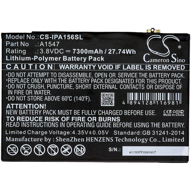 Revitalize your Apple tablet with the high-performance Cameron Sino CS-IPA156SL replacement battery. Designed to power your devices efficiently, this Li-Polymer battery boasts a substantial capacity of 7300mAh and operates at a voltage of 3.8V, providing an impressive 27.74Wh of energy to keep you connected longer. With its sleek black design and ultra-thin profile measuring 186.50 x 130.00 x 3.50mm, this battery perfectly fits your tablet while maintaining its stylish appearance.