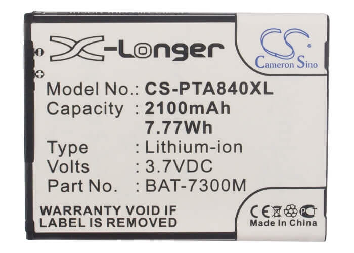 Our batteries from Cameron Sino are built using high quality parts and cells from leading manufacturers, be assured this battery will function the same as the OEM battery. If both your model number and battery number are listed in the product description you can be almost certain that you are ordering the correct battery. If we say it will fit and both these details match your product and it still does not fit we will exchange or refund the battery at our expense. This battery is designed to replace the battery in models described below Chemistry Li-ion Voltage 3.7VCapacity2100mAh / 7.77Wh Warranty 1 Year Model Number CS-PTA840XL Color BlackDimensions(mm)63.75 x 50.17 x 5.40mmReplaces ManufacturersPantechIf both your model number and battery number are listed in the product description you can be almost certain that you are ordering the correct battery. If we say it will fit and both these details match your product and it still does not fit we will exchange or refund the battery at our expense. it's important to confirm the information from your device before ordering, contact us before ordering if you are not sure. 12 Months warranty is usually standard on all Cameron Sino products. If there is any difference in this policy it will be stated on this page. Any misuse of the battery or modifications will invalidate the warranty. Battery life is dictated by a number of different factors, including temperature, charging frequency and type of charger. As a rule of thumb Nimh cells can be charged around 500 times, Lithium Ion around 400 times and Lithium polymer Around 400 times. This can increase or decrease depending on the use of the battery. Being an ISO 9001 certified factory means that the Cameron Sino range of batteries have to be manufactured with only the highest quality components. You can rest assured that the batteries we supply are fully tested in the devices they are designed for and are built with all the same safety protocols as the original OEM battery. This product is designed to replace batteries as shown in the specifications table below. Special Remarks:-Device Models and Battery numbers that this battery is known to support:-Device Models SupportedPantech, Im-a840l, Im-a840s, Im-a840sp, Sky Im-a840s, Vega S5, Sky, Im-a840s, Im-a840sp, Sky Im-a840s, Vega S5 Battery Models Supported Pantech, Bat-7300m, Sky, Bat-7300mManufacturers that this product will replace:- Manufacturers Supported Actual manufacturerPantechCameron SinoBattery Selection (Please read - Important)There are so many different models of battery available today for so many different products. it's easy to make a mistake. It may be worth you confirming with us if you are really not sure which battery to order. We try to keep our records updated to the best of our ability but manufacturers can change fitment without notice.Usually if the capacity of the battery that you are viewing here is much greater than your original this may mean that the battery is larger and will either require the cover provided to be used or may protrude from your device. The battery will still fit and function but this may affect fitment into any cases or holders that you may have.