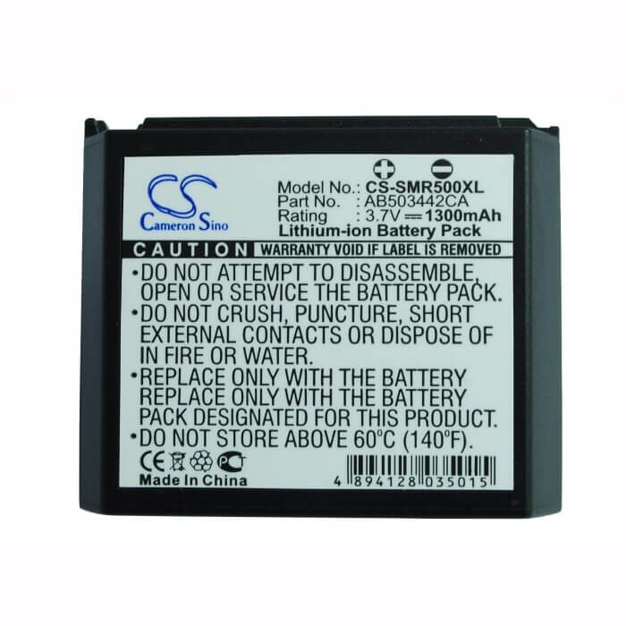 The battery we supply although a generic version of the battery is designed and built to be as robust and as good quality as the original OEM battery. Battery selection can be a complicated process. Leave the selection to the experts if you are really not sure. We can be contacted easily by live chat or by email. We will respond to your query within eight business hours. This battery is designed to replace the battery in models described below Chemistry Li-ion Voltage 3.7VCapacity1300mAh / 4.81Wh Warranty 1 Year Model Number CS-SMR500XL Color SilverDimensions(mm)37.07 x 43.09 x 11.53mmReplaces ManufacturersSamsungBattery selection can be a complicated process. Leave the selection to the experts if you are really not sure. We can be contacted easily by live chat or by email. We will respond to your query within eight business hours. Confirm the fitment of this battery by checking that your model and your battery number are shown in the details below. If for any reason the product develops a manufacturing defect during the 12 month warranty period we will replace the defective item free of charge. We use top-quality cells in all of our products but all cells have a cycle life. You can expect that a Lithium Ion or a lithium Polymer cell will last for around four hundred cycles, Nimh can be cycled for around 500 cycles. it's always best to charge your battery only when it gets low. Continual charging will reduce the overall life expectancy of your battery. The batteries we supply are manufactured to a very high standard. To keep our ISO 9001 certification strict protocols need to be followed. This ensures that the replacement batteries are safe to use in the device they were designed for. This battery should meet or exceed the specifications of the original OEM battery. Fitments that we know that this battery are shown below. Special Remarks:-Extended Battery With Silver Color Back CoverDevice Models and Battery numbers that this battery is known to support:-Device Models SupportedSamsung, Sch-r500 Battery Models Supported Samsung, Ab503442babstd, Ab503442caManufacturers that this product will replace:- Manufacturers Supported Actual manufacturerSamsungCameron SinoBattery Selection (Please read - Important)Please make sure that the device manufacturer, The model number and also the battery part number are all listed in our product details. Some manufacturers have more than one battery type fitted in like models. We recommend that you remove the original battery before ordering to confirm this. If you are not sure we may be able to confirm for you.Please be advised that some higher capacity batteries are larger than the standard battery from the manufacturers. Please make sure that your model number is shown in the information above before ordering. If there is any doubt contact us first and we can advise if this is a suitable replacement for your device.