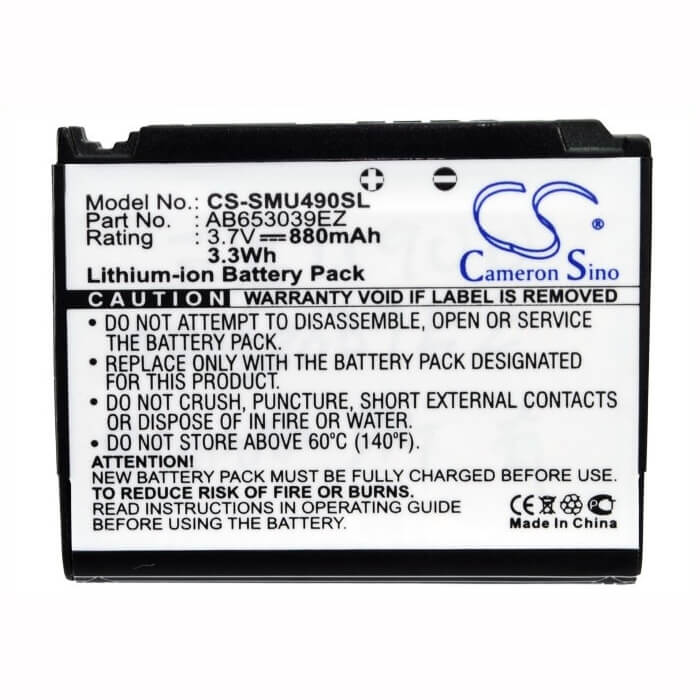 The battery that is shown on this page is manufactured using the highest quality parts. Finding the right battery for your product can be difficult. There are so many models and part numbers it can be really confusing. it's easier to reach out to us first than it is to return the product later. Please contact us if you are really not sure which battery you need. This battery is designed to replace the battery in models described below Chemistry Li-ion Voltage 3.7VCapacity880mAh / 3.26Wh Warranty 1 Year Model Number CS-SMU490SL Color BlackDimensions(mm)40.52 x 32.55 x 6.59mmReplaces ManufacturersSamsungFinding the right battery for your product can be difficult. There are so many models and part numbers it can be really confusing. it's easier to reach out to us first than it is to return the product later. Please contact us if you are really not sure which battery you need. Please match both the model of your device and battery number before ordering. Our warranty period is usually stated here on the product page, Most products come with a 1 year warranty, Some products do have 6 months. Details of what is included as part of our warranty can be seen in our information pages. Lithium Ion and Lithium polymer cells usually last for between 400 and 500 cycles, Nimh cells have the ability to be charged for around 500 cycles, cycle life will vary according to a number of different factors. There is no set life cycle of any of these cells. Factors that influence their life include temperature, humidity and amount of charges. All the batteries that we supply by Cameron Sino are designed to be as long lasting as the original OEM battery. Our ISO 9001 certified battery uses high quality components and each cells rating can be seen in the table above. Actual capacity and voltage may vary slightly from the original due to cell availability. This product is designed to replace batteries as shown in the specifications table below. Special Remarks:-Device Models and Battery numbers that this battery is known to support:-Device Models SupportedSamsung, Sch-u490, Sch-u900, U490 Trance, U900 Flipshot Battery Models Supported Samsung, Ab653039ez, Ab653039ezbstdManufacturers that this product will replace:- Manufacturers Supported Actual manufacturerSamsungCameron SinoBattery Selection (Please read - Important)Please make sure that the device manufacturer, The model number and also the battery part number are all listed in our product details. Some manufacturers have more than one battery type fitted in like models. We recommend that you remove the original battery before ordering to confirm this. If you are not sure we may be able to confirm for you.Please be advised that some higher capacity batteries are larger than the standard battery from the manufacturers. Please make sure that your model number is shown in the information above before ordering. If there is any doubt contact us first and we can advise if this is a suitable replacement for your device.