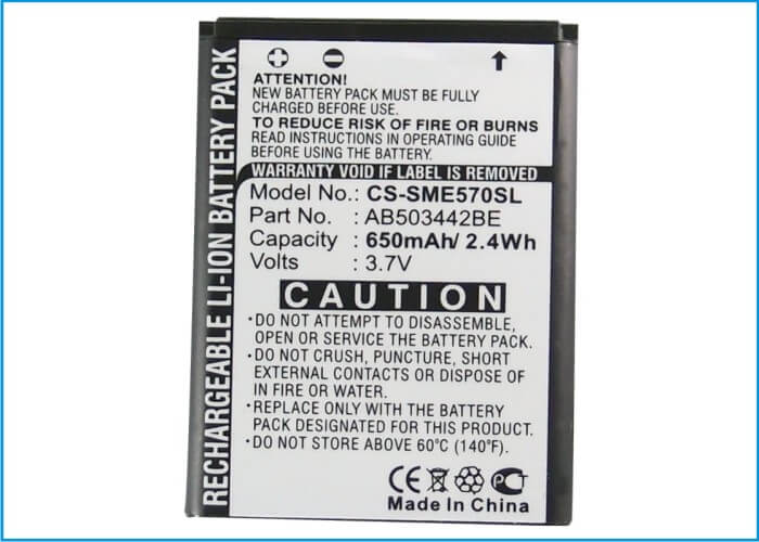 3.7V, Li-ion, 650mAh, SmartPhone battery fits Samsung, Ab503442be, Sgh-b110, Sgh-e570, 2.41Wh