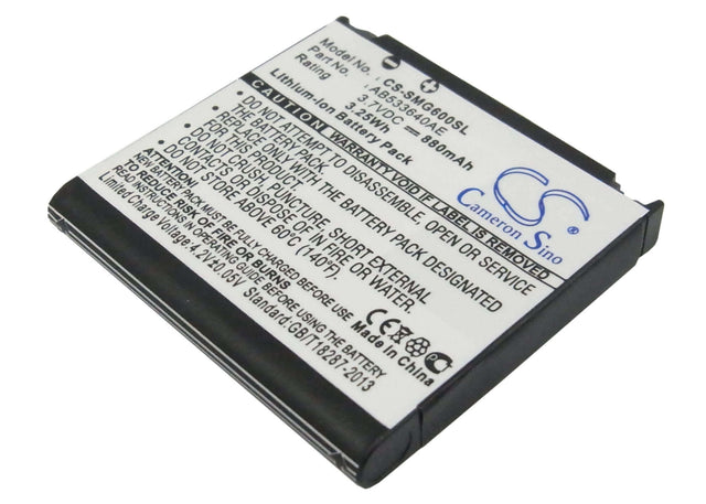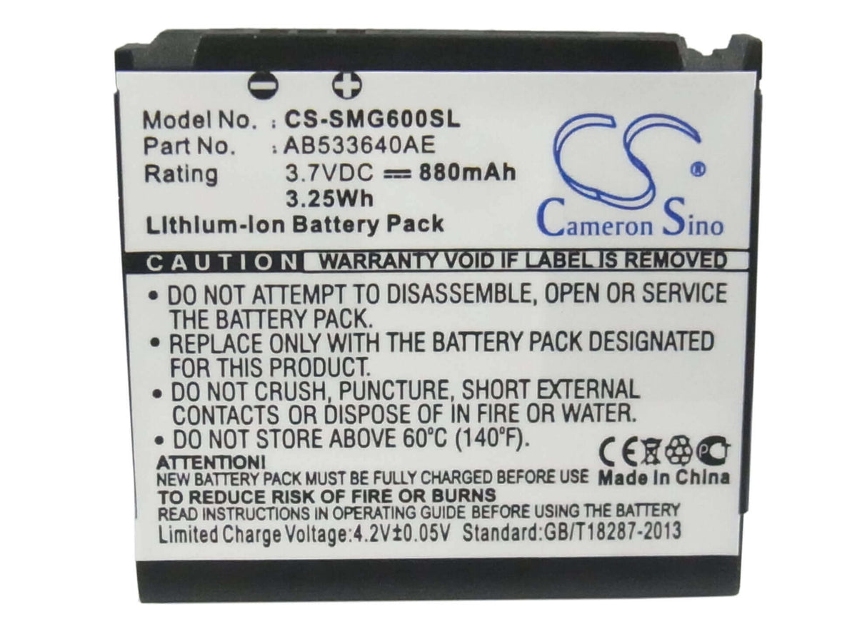 Are generic batteries as good as the original batteries you may ask, usually yes! Sometimes because of cell availability the capacity of our batteries may be slightly higher or slightly lower. This will not affect the operation of your device. If the milli Amp hour is higher that just means a longer runtime. Batteries come in all shapes and sizes, quite often a single model of battery will actually replace hundreds of other models. The manufacturers in their wisdom have assigned different part numbers to like batteries. We can usually cross reference this type of product to the correct replacement for you. This battery is designed to replace the battery in models described below Chemistry Li-ion Voltage 3.7VCapacity880mAh / 3.26Wh Warranty 1 Year Model Number CS-SMG600SL Color BlackDimensions(mm)41.00 x 39.00 x 5.50mmReplaces ManufacturersSamsungBatteries come in all shapes and sizes, quite often a single model of battery will actually replace hundreds of other models. The manufacturers in their wisdom have assigned different part numbers to like batteries. We can usually cross reference this type of product to the correct replacement for you. You can confirm that this particular battery will fit your device by checking the tables below. Our warranty is valid for a period of one-year, unless otherwise stated. The warranty covers the product against any manufacturing defect. Different chemistries of batteries have different cycle lives, Li-Ion usually lasts for around 400 to 500 cycles, Lithium Polymer is the same. Nimh batteries will usually last for around 500 cycles. A cycle is a full discharge and recharge of the battery. The batteries we supply are manufactured to a very high standard. To keep our ISO 9001 certification strict protocols need to be followed. This ensures that the replacement batteries are safe to use in the device they were designed for. This battery should meet or exceed the specifications of the original OEM battery. This replacement battery is designed to replace the models shown below. Special Remarks:-Device Models and Battery numbers that this battery is known to support:-Device Models SupportedSamsung, M8800, S3600, S3600c, Sgh-f268, Sgh-f330, Sgh-f338, Sgh-f490, Sgh-g400, Sgh-g600, Sgh-g600i, Sgh-g608, Sgh-j630, Sgh-j638 Battery Models Supported Samsung, Ab533640ae, Ab533640aec, Ab533640aecstd, Ab533640ce, Ab533640cu, Ab563850deManufacturers that this product will replace:- Manufacturers Supported Actual manufacturerSamsungCameron SinoBattery Selection (Please read - Important)All information that we provide with regards to fitment is supplied by the manufacturers as a final check it's worth comparing your original battery with the one shown. We keep our records as up-to-date as possible but new fitments come on stream every week due to the launch of new products.Please be advised that some higher capacity batteries are larger than the standard battery from the manufacturers. Please make sure that your model number is shown in the information above before ordering. If there is any doubt contact us first and we can advise if this is a suitable replacement for your device.