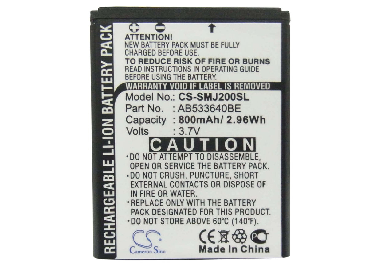 3.7V, Li-ion, 800mAh, SmartPhone battery fits Samsung, Ab533640be, Sgh-j200, 2.96Wh
