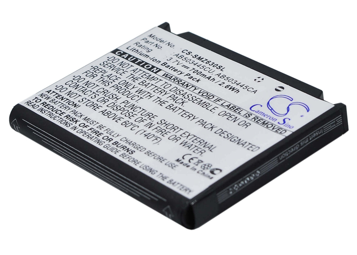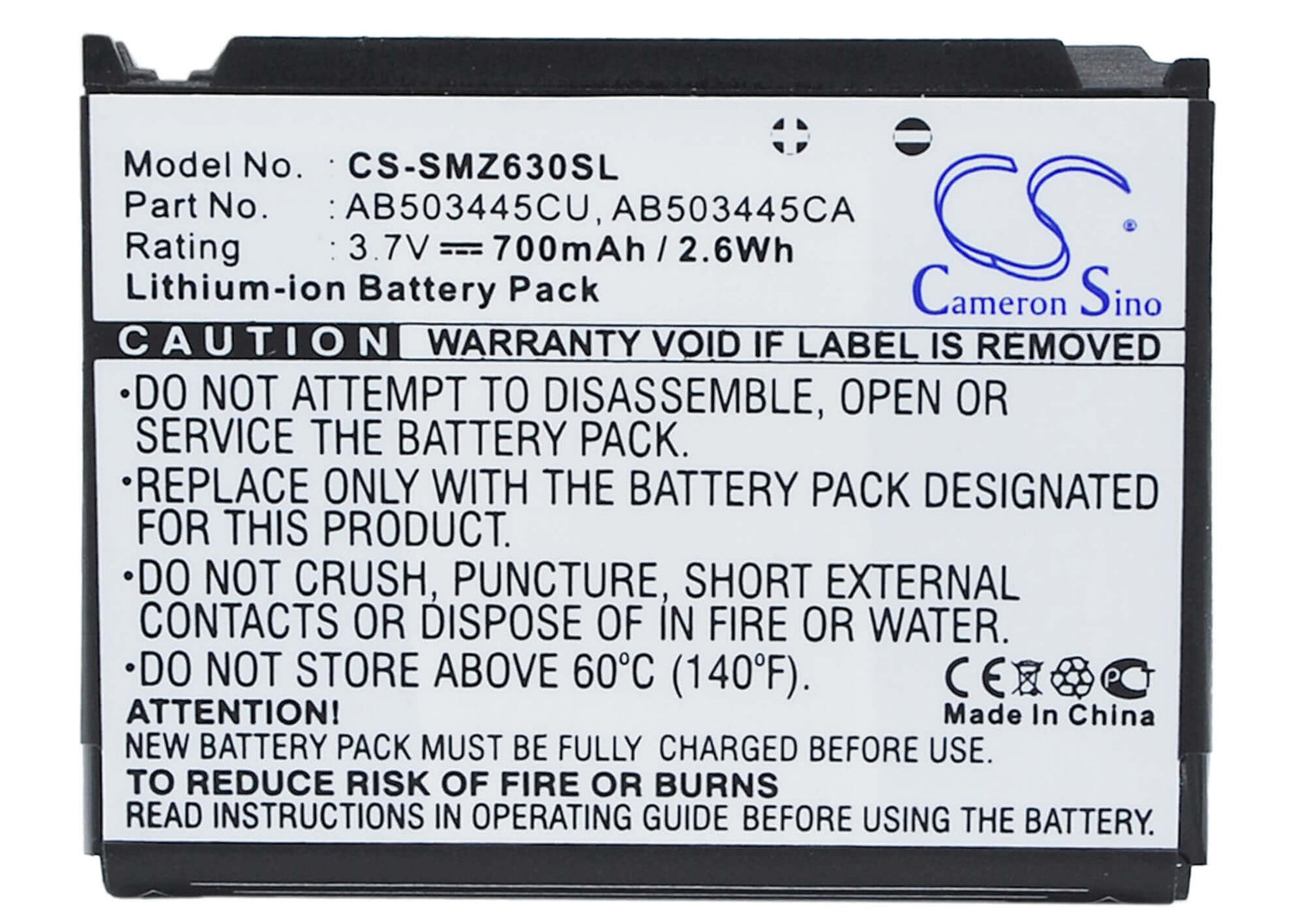Canadian Batteries have supplied the replacement batteries from Cameron Sino for nearly a decade. In that time we have had zero instances of a product being damaged while using one of our batteries. We endeavor to keep our data as current as possible, but there will be occasions when new models have not been updated to the website yet. Contact us and we will confirm fitment. This battery is designed to replace the battery in models described below Chemistry Li-ion Voltage 3.7VCapacity700mAh / 2.59Wh Warranty 1 Year Model Number CS-SMZ630SL Color BlackDimensions(mm)46.43 x 36.01 x 5.34mmReplaces ManufacturersSamsungWe endeavor to keep our data as current as possible, but there will be occasions when new models have not been updated to the website yet. Contact us and we will confirm fitment. Make sure you check that both your battery model and device are shown the information tables below. We offer a one-year warranty to guarantee against manufacturing defects unless otherwise stated, The warranty covers against defects from manufacture but not if the battery has been misused or modified. If you look after your new battery and only charge the battery when it gets low, This will extend the life of the battery. If the battery is charged too often you will use up the cycle life quickly. The batteries we supply are manufactured to a very high standard. To keep our ISO 9001 certification strict protocols need to be followed. This ensures that the replacement batteries are safe to use in the device they were designed for. This battery should meet or exceed the specifications of the original OEM battery. Check that your product is shown below in the products table. Special Remarks:-Device Models and Battery numbers that this battery is known to support:-Device Models SupportedSamsung, Giorgio Armani, Gloss, Sch-b540, Sch-w2700, Sgh-p520, Sgh-p520 Giorgio, Sgh-p528, Sgh-t629, Sgh-z540, Sgh-z540v, Sgh-z630, Sph-w2700 Battery Models Supported Samsung, Ab503445ca, Ab503445ck, Ab503445cuManufacturers that this product will replace:- Manufacturers Supported Actual manufacturerSamsungCameron SinoBattery Selection (Please read - Important)There are so many different models of battery available today for so many different products. it's easy to make a mistake. It may be worth you confirming with us if you are really not sure which battery to order. We try to keep our records updated to the best of our ability but manufacturers can change fitment without notice.Please be advised that some higher capacity batteries are larger than the standard battery from the manufacturers. Please make sure that your model number is shown in the information above before ordering. If there is any doubt contact us first and we can advise if this is a suitable replacement for your device.