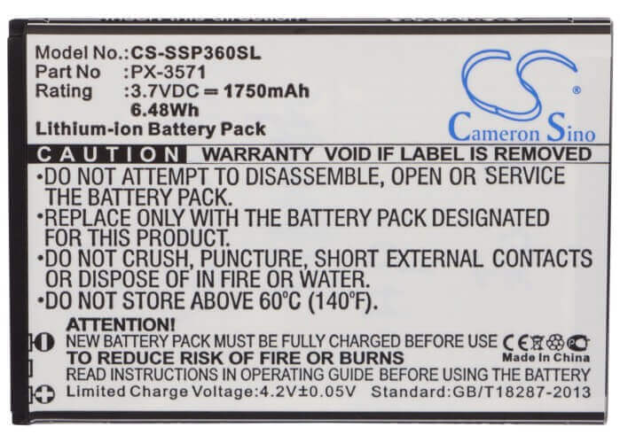 This battery should be the same or greater capacity than the original battery Choosing the right battery can be an absolute nightmare and for those of you less technically inclined very difficult. We do recommend that you remove the old battery before ordering if at all possible. This really is the best thing to do. Quite a few manufacturers have 2 or 3 different types of battery fitted in one model. We can usually confirm fitment from the battery model number for you. This battery is designed to replace the battery in models described below Chemistry Li-ion Voltage 3.7VCapacity1750mAh / 6.48Wh Warranty 1 Year Model Number CS-SSP360SL Color BlackDimensions(mm)72.30 x 52.05 x 5.00mmReplaces ManufacturersSimvalleyChoosing the right battery can be an absolute nightmare and for those of you less technically inclined very difficult. We do recommend that you remove the old battery before ordering if at all possible. This really is the best thing to do. Quite a few manufacturers have 2 or 3 different types of battery fitted in one model. We can usually confirm fitment from the battery model number for you. All of our replacement batteries are designed to replace the models that we list in our tables below. The warranty we offer is for 12 months, this covers your product against manufacturing defects. If for any reason the product fails within this period we will replace it free of chargeonce we receive the product back for testing. Lithium Ion and Lithium polymer cells usually last for between 400 and 500 cycles, Nimh cells have the ability to be charged for around 500 cycles, cycle life will vary according to a number of different factors. There is no set life cycle of any of these cells. Factors that influence their life include temperature, humidity and amount of charges. If you are looking for a High quality replacement battery with ISO 9001 certifications in place then look no further. This battery is designed to be as robust and as safe as the original OEM battery. Cameron Sino actually manufacture batteries for many OEM companies. The only difference that you will find is the label that is installed. Check that your product is shown below in the products table. Special Remarks:-Device Models and Battery numbers that this battery is known to support:-Device Models SupportedSimvalley, Sp-360 Battery Models Supported Simvalley, Px-3571, Px-3571-675, Px-3571-912Manufacturers that this product will replace:- Manufacturers Supported Actual manufacturerSimvalleyCameron SinoBattery Selection (Please read - Important)There are three important pieces of data that you will need to have to confirm the fitment of this battery in your device. You will need the model of your device, The battery number - found on the original battery and the manufacturer. This is the only way to be 100 sure this is the correct battery.Batteries shown with an extended back cover in the image above will need to use this cover. The battery is larger and the cover is required to be able to fit the device properly. This may affect fitment into any cases or holders you may have. Extended capacity batteries for laptops may be larger and protrude from the rear of your laptop or may raise the laptop up at the bottom