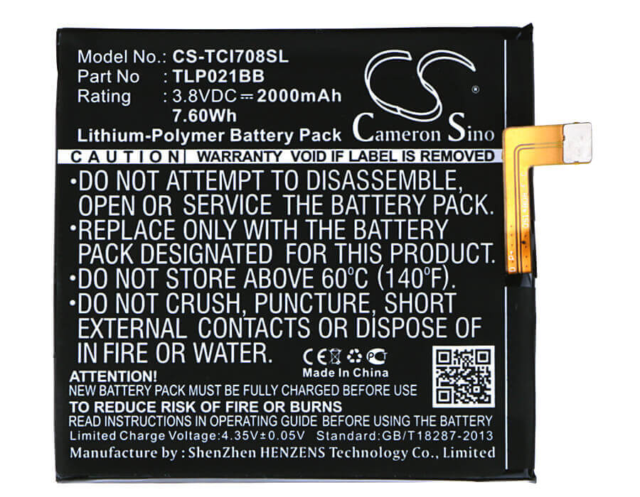 Unlock uninterrupted performance with the Cameron Sino CS-TCI708SL replacement battery, designed specifically for Tcl SmartPhone. This high-quality 2000mAh / 7.6Wh Li-Polymer battery delivers a reliable 3.8V voltage with an energy rating of 7.6Wh, ensuring your device operates at peak efficiency throughout extended sessions. Whatever you are doing this battery provides the power and reliability you need.