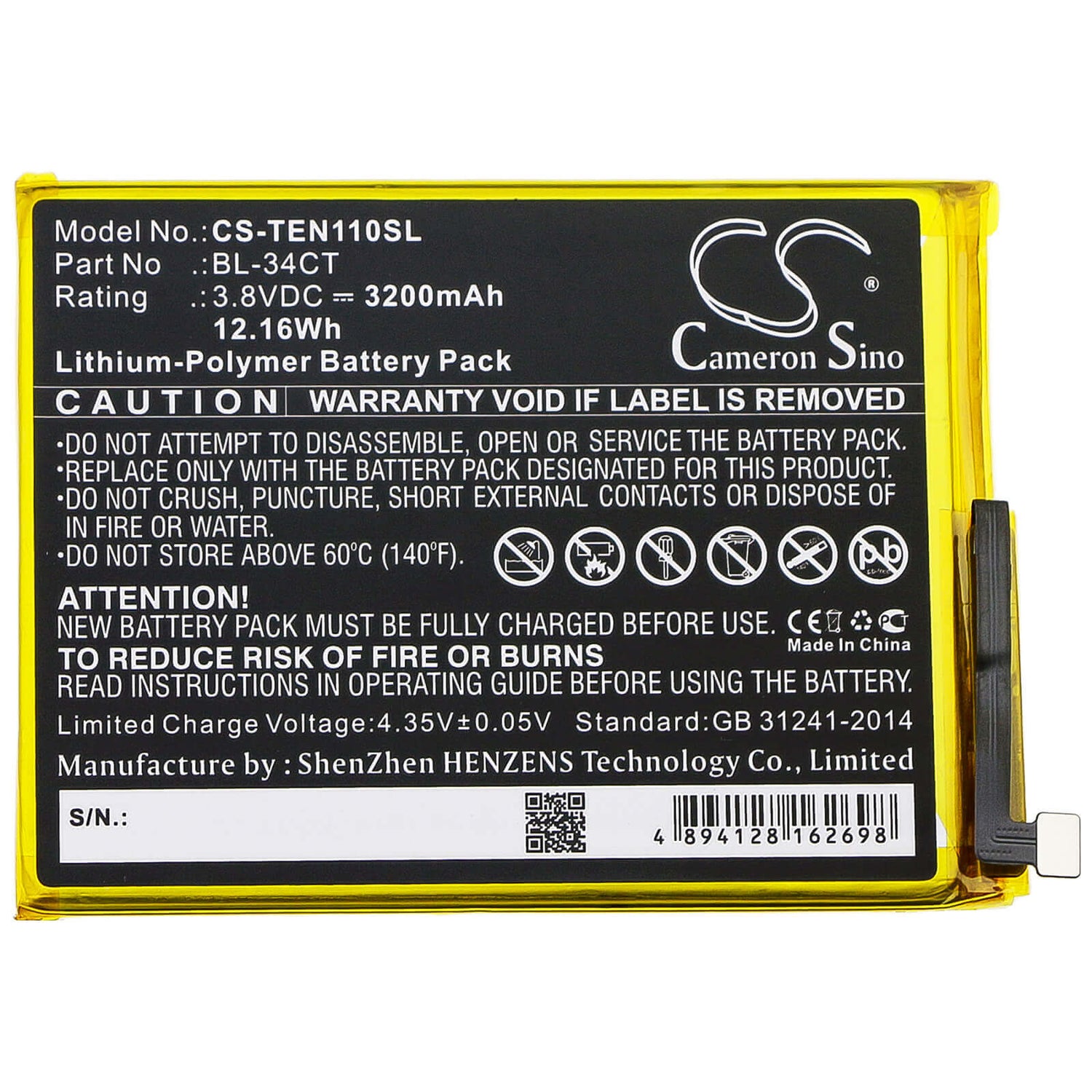 Unlock uninterrupted performance with the Cameron Sino CS-TEN110SL replacement battery, designed specifically for Tecno SmartPhone. This high-quality 3200mAh / 12.16Wh Li-Polymer battery delivers a reliable 3.8V voltage with an energy rating of 12.16Wh, ensuring your device operates at peak efficiency throughout extended sessions. Whatever you are doing this battery provides the power and reliability you need.