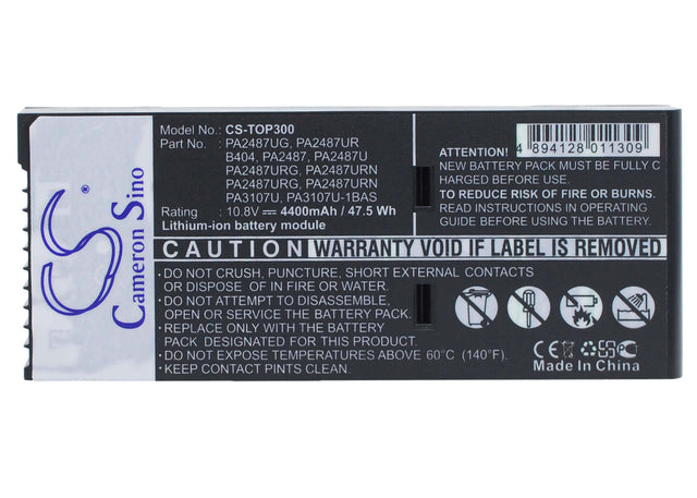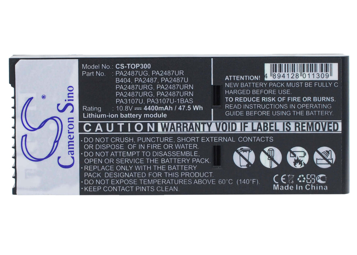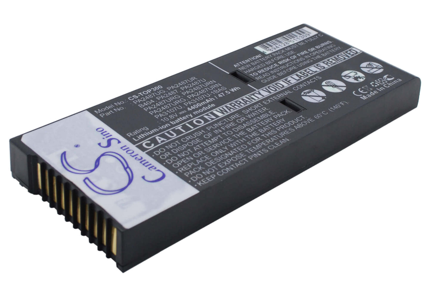 For nearly 10 Years we have supplied our current range of batteries, We have found our current suppliers to be of the highest quality and have thousands of happy customers using our products in Canada. Quite often due to the data not being available this battery will fit unlisted models. As this information comes available we do update these fitments on a regular basis. If you are not sure as to which battery you need to order please contact us and we can guide your selection. This battery is designed to replace the battery in models described below Chemistry Li-ion Voltage 10.8VCapacity4400mAh / 47.52Wh Warranty 1 Year Model Number CS-TOP300 Color BlackDimensions(mm)174.90 x 70.30 x 18.60mmReplaces ManufacturersToshibaQuite often due to the data not being available this battery will fit unlisted models. As this information comes available we do update these fitments on a regular basis. If you are not sure as to which battery you need to order please contact us and we can guide your selection. Usually We can confirm the fitment for you, if you are not sure how to locate the correct information on your device please contact us and we will identify the correct battery for you. We offer a one-year warranty to guarantee against manufacturing defects unless otherwise stated, The warranty covers against defects from manufacture but not if the battery has been misused or modified. As a rough guide lithium Ion batteries can be charged around 400 times, Nimh usually around 500 times and Lithium polymer around 400 times. Being an ISO 9001 certified factory means that the Cameron Sino range of batteries have to be manufactured with only the highest quality components. You can rest assured that the batteries we supply are fully tested in the devices they are designed for and are built with all the same safety protocols as the original OEM battery. Devices that this battery are known to fit can be seen in our listing below. Special Remarks:-Device Models and Battery numbers that this battery is known to support:-Device Models SupportedToshiba, Dynabook Satellite 1800, Dynabook Satellite 1850, Dynabook Satellite 1860, Dynabook Satellite 1870, Dynabook T2/485pmc, Dynabook T2/485prc, Dynabook T3/ 410pme, Dynabook T3/480cme, Dynabook T4/ 410pme, Dynabook T4/ 495cme, Dynabook T5/512cme, Dynabook T5/x16pme, Dynabook T6/518cde, Dynabook T6/518cme, Satellite 1400, Satellite 1400-103, Satellite 1400-153, Satellite 1400-153e, Satellite 1400-203, Satellite 1400-253s, Satellite 1400-503, Satellite 1400-553s, Satellite 1400-s151, Satellite 1400-s152, Satellite 1405, Satellite 1405-s151, Satellite 1405-s152, Satellite 1405-s171, Satellite 1410, Satellite 1410-303, Satellite 1410-303x, Satellite 1410-304, Satellite 1410-354, Satellite 1410-401, Satellite 1410-554, Satellite 1410-604, Satellite 1410-704, Satellite 1410-714, Satellite 1410-801, Satellite 1410-802, Satellite 1410-814, Satellite 1410-902, Satellite 1410-s102, Satellite 1410-s103, Satellite 1410-s173, Satellite 1410-s174, Satellite 1410-s203, Satellite 1415, Satellite 1415-s173, Satellite 1415-s174, Satellite 1500, Satellite 1550, Satellite 1555, Satellite 1555cds, Satellite 1800, Satellite 1800-100, Satellite 1800-204, Satellite 1800-254s, Satellite 1800-314, Satellite 1800-354s, Satellite 1800-364e, Satellite 1800-400, Satellite 1800-412, Satellite 1800-452e, Satellite 1800-504, Satellite 1800-514, Satellite 1800-554s, Satellite 1800-614, Satellite 1800-654s, Satellite 1800-700, Satellite 1800-712, Satellite 1800-750, Satellite 1800-752s, Satellite 1800-804, Satellite 1800-814, Satellite 1800-911, Satellite 1800-921, Satellite 1800-s203, Satellite 1800-s204, Satellite 1800-s253, Satellite 1800-s254, Satellite 1805, Satellite 1805-s203, Satellite 1805-s204, Satellite 1805-s253, Satellite 1805-s254, Satellite 1805-s274, Satellite 1830, Satellite 200, Satellite 2060, Satellite 2060cds, Satellite 2065cds, Satellite 2100, Satellite 2100cds, Satellite 2100cdt, Satellite 2100cdx, Satellite 2105cds, Satellite 210cdt, Satellite 2115cds, Satellite 2140, Satellite 2140cds, Satellite 2140xcds, Satellite 2180, Satellite 2180cdt, Satellite 220, Satellite 220cds, Satellite 2210, Satellite 2210cds, Satellite 2210cdt, Satellite 2210xcds, Satellite 2230, Satellite 2230cds, Satellite 2250, Satellite 2250cdt, Satellite 2250xcds, Satellite 225cds, Satellite 230cds, Satellite 230cx, Satellite 235cds, Satellite 2400, Satellite 2400-103, Satellite 2400-103dvd, Satellite 2400-s201, Satellite 2400-s202, Satellite 2400-s251, Satellite 2400-s252, Satellite 2405, Satellite 2405-s201, Satellite 2405-s202, Satellite 2410, Satellite 2410-303, Satellite 2410-304, Satellite 2410-304s, Satellite 2410-404, Satellite 2410-413, Satellite 2410-414, Satellite 2410-514, Satellite 2410-515, Satellite 2410-601, Satellite 2410-603, Satellite 2410-703, Satellite 2410-s203, Satellite 2410-s204, Satellite 2410-s205, Satellite 2410-s206, Satellite 2410-s403, Satellite 2410-s453, Satellite 250, Satellite 2500, Satellite 2500cds, Satellite 2500cdt, Satellite 2505cds, Satellite 2505cdt, Satellite 2510, Satellite 2510cds, Satellite 2515cds, Satellite 2515cts, Satellite 2520, Satellite 2520cdt, Satellite 2530, Satellite 2530cds, Satellite 2535cd, Satellite 2535cds, Satellite 2540, Satellite 2540cds, Satellite 2540cdt, Satellite 2540xcdt, Satellite 2545cds, Satellite 2545cdt, Satellite 2545xcdt, Satellite 2550, Satellite 2590, Satellite 2590cds, Satellite 2590cdt, Satellite 2590xdvd, Satellite 2595cds, Satellite 2595cdt, Satellite 2595xdvd, Satellite 2600, Satellite 2610, Satellite 2610cdt, Satellite 2610dvd, Satellite 2615dvd, Satellite 2650, Satellite 2650xdvd, Satellite 2655xdvd, Satellite 2670, Satellite 2670dvd, Satellite 2675dvd, Satellite 2710, Satellite 2710xdvd, Satellite 2715dvd, Satellite 2715xdvd, Satellite 2740, Satellite 2750, Satellite 2750dvd, Satellite 2750xdvd, Satellite 2755dvd, Satellite 2755xdvd, Satellite 2770, Satellite 2770xdvd, Satellite 2775xdvd, Satellite 2800, Satellite 2800-1